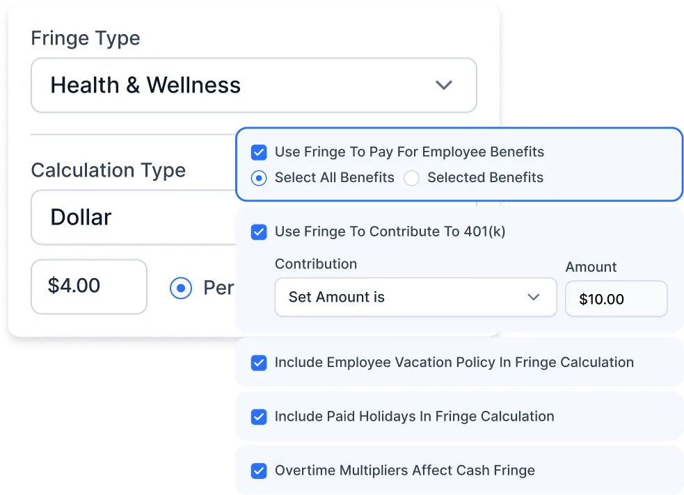 Include fringe benefits such as vacation, holidays, union benefits, and 401(k) contributions in compliant payroll calculations.