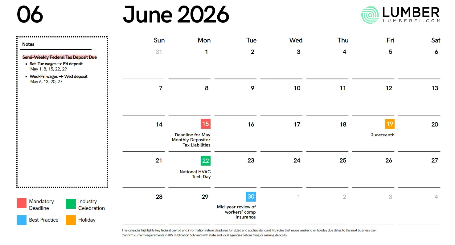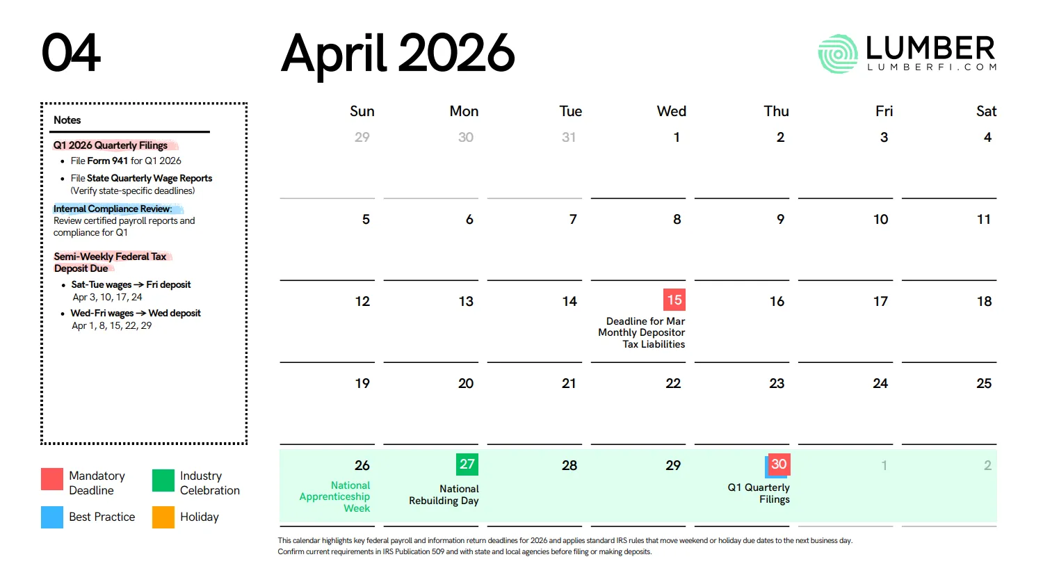 We encourage you to share this calendar with your accounting team, project managers, and anyone else involved in payroll and compliance at your organization. Print it, save it, reference it regularly—and don't hesitate to reach out to our team if you have questions about specific deadlines or how Lumber can help streamline your payroll processes.