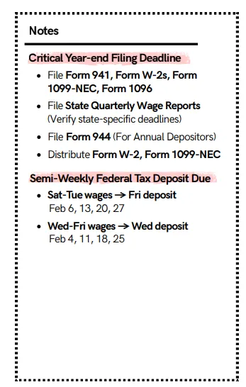 This calendar spans the entire year, starting with Q4 2025 year-end closeouts in January and running through December's final payroll verifications. We've organized it to help you proactively manage compliance risks, streamline your operations, and stay audit-ready throughout 2026.