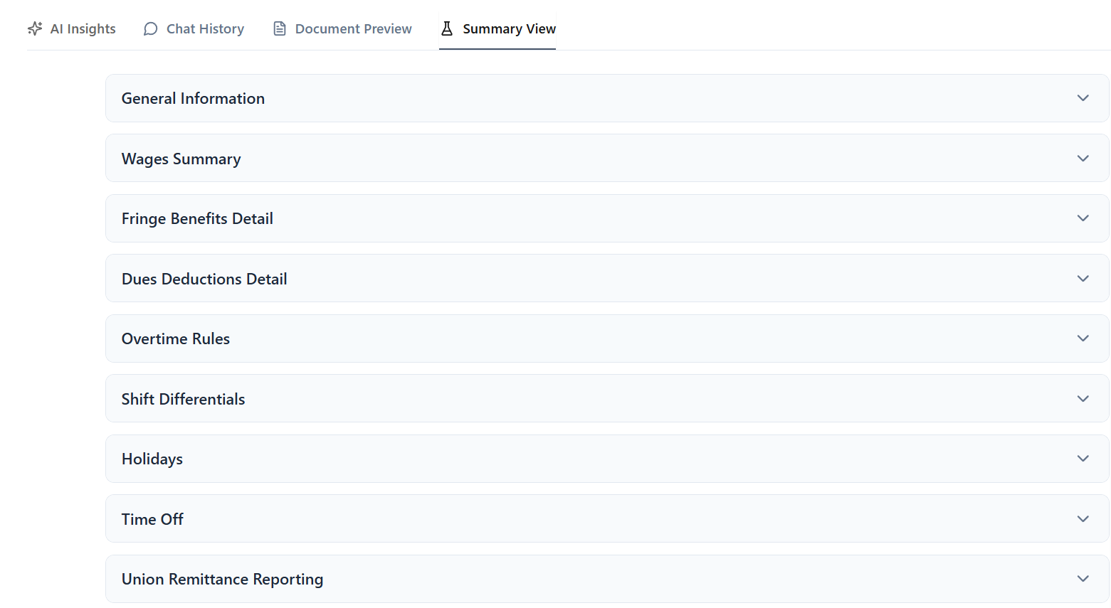 CBAs are dense legal documents, often running hundreds of pages, with distinct rules for different classifications, geographic zones, and project types. Rate tables, fringe schedules, overtime provisions, and special rules are spread across the document in non-standardized formats. Locating and cross-referencing this information manually is time-consuming and easy to get wrong.