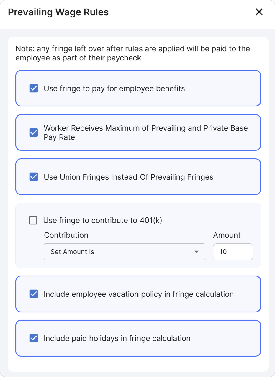 Union payroll: Union employees require tracking of fringe benefit contributions — health, pension, annuity — by hours worked and trade classification. These vary by collective bargaining agreement. Your new provider needs to handle multiple union agreements simultaneously if you operate across different trades or jurisdictions.