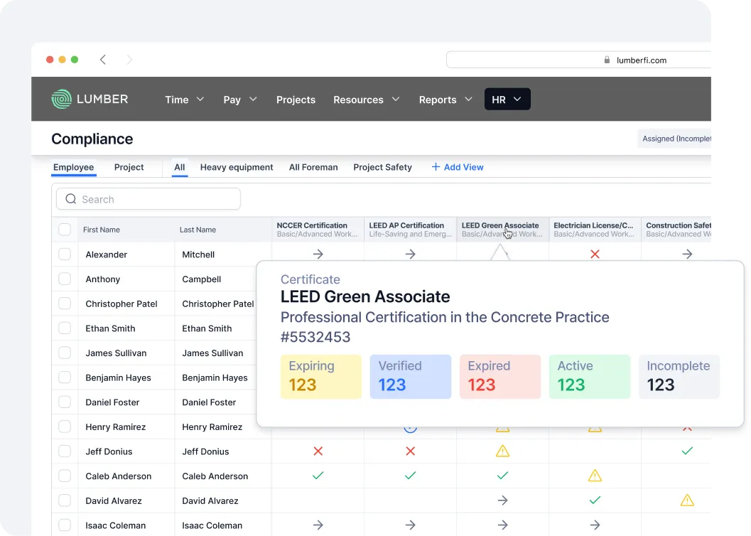 Powered by BuilderFax, Lumber tracks every license, credential, and union membership so nothing slips through the cracks.