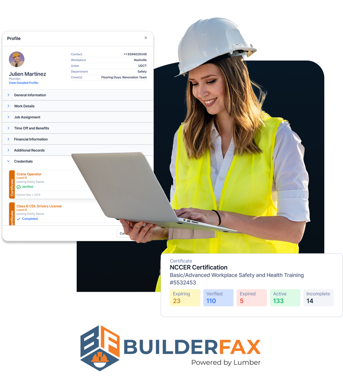 Keep all certifications, licenses, and training records for your workers in one centralized location—powered by BuilderFax and built right into Lumber. Never miss renewals, reduce compliance risks, and stay job-site ready.
