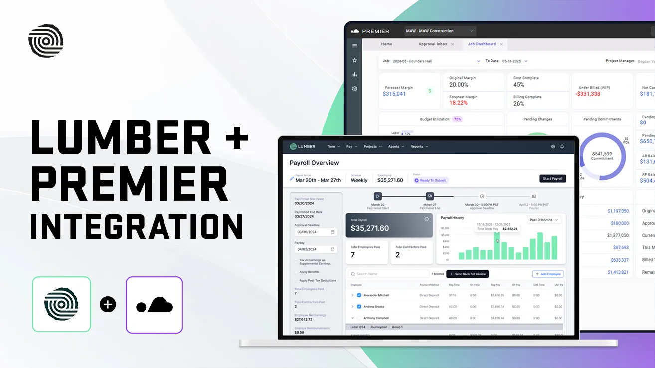 The Lumber + Premier integration tackles these challenges head-on by creating a unified ecosystem specifically designed for construction workflows. Both platforms were built from the ground up with construction companies in mind, understanding the unique complexities of project-based work, union requirements, prevailing wage compliance, and multi-location operations.