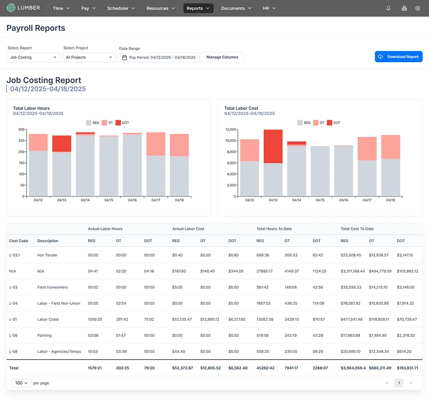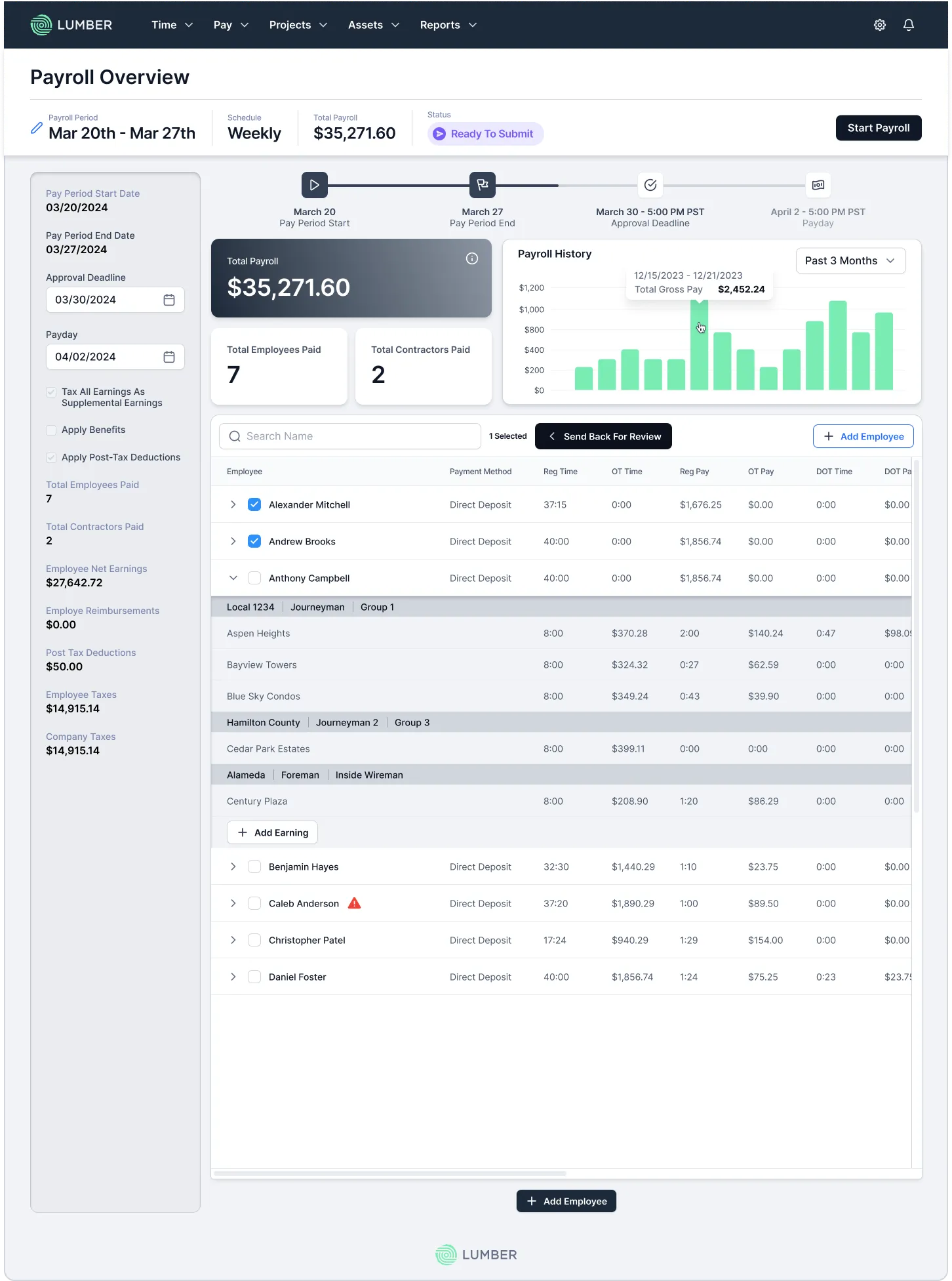 Lumber complements this with modern, compliance-first payroll and workforce management. Built specifically for construction, Lumber handles complex payroll scenarios, including union rates, prevailing wages, multi-state compliance, and certified payroll reporting. Its intuitive interface and automated compliance features help construction companies stay on top of ever-changing labor regulations across the US and Canada.