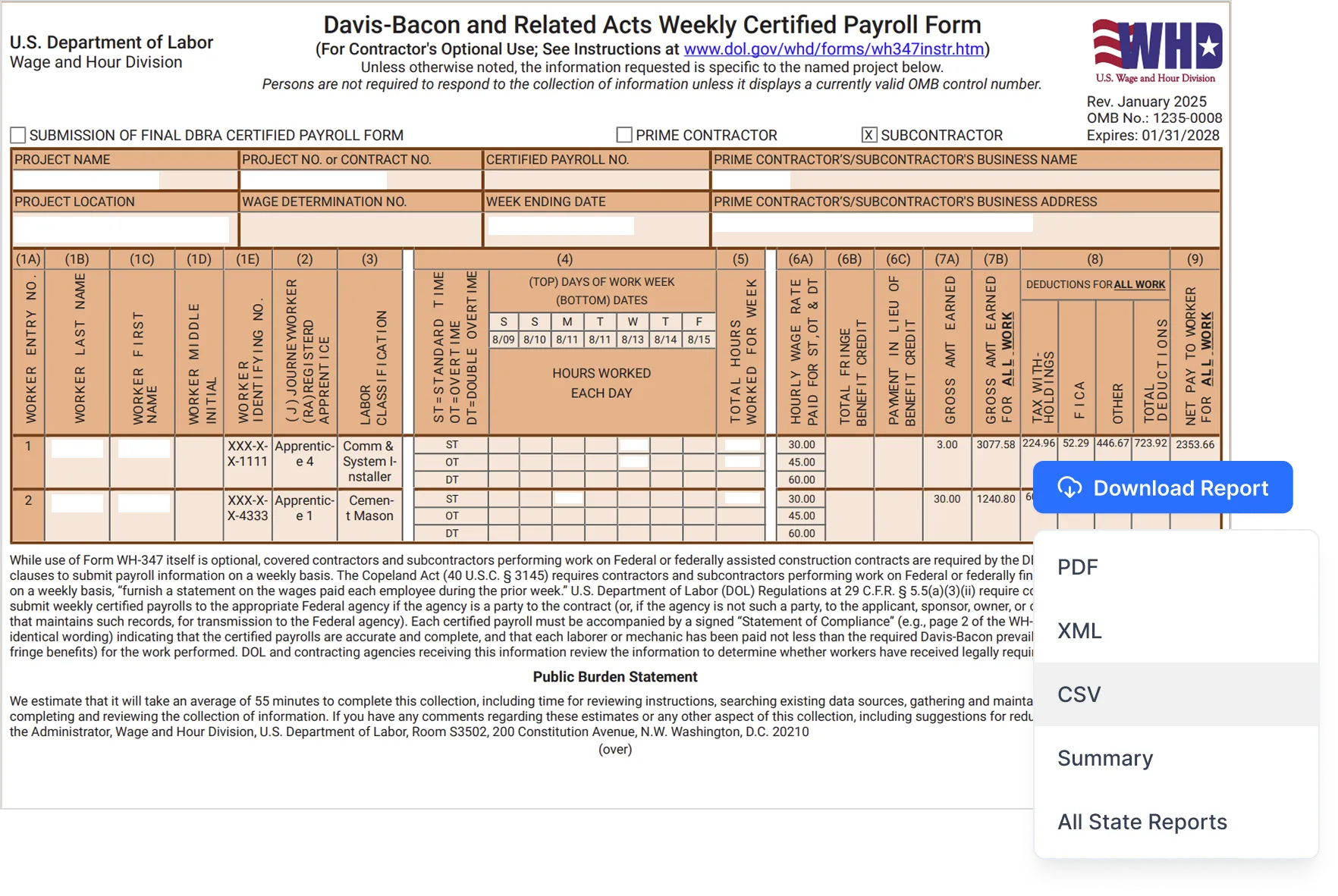 Whether you’re working on federal projects, state public works, or local prevailing wage jobs, Lumber compiles all data into compliant reports automatically, applying the correct rates and classifications.