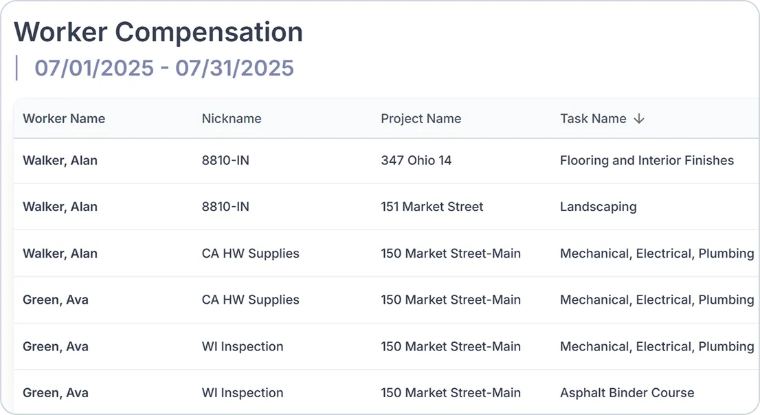 Lumber provides workers’ compensation reports detailing employee hours, comp codes used, project locations, and other compliance data useful for insurance and auditing.